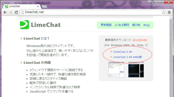 http://limechat.net/ にアクセスし、インストーラをダウンロードします。